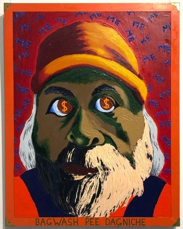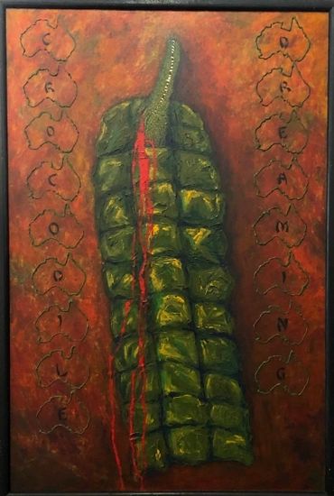 In the early 80s, buoyed by a friend’s description of his style as Ocker Funk, Kim decided to improve and strengthen his drawing skills, spending several years studying and working at the Canberra School of Art. Whether Ocker Funk or not, the paintings got bigger, more confident, less conventional and overtly satirical. The subject matter and themes were frequently political. After all, it was the 1980s, greed was good and, as his work shows, there was no shortage of inspiration.