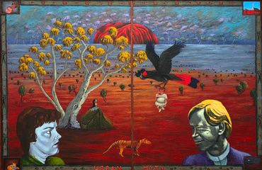 And so thirty years on, though most of the faces have changed, the world with its stupidities have not. One of Kim’s early paintings depicts a pair of Prince Albert Rifle-birds in conversation - one is saying to the other ‘It’s going to be a very strange sort of world with only a fifth or an eighth of us left’. Through these works, we invite you to remember a truly subversive artist and a wonderful, thoroughly decent human being, and to reflect on the strange sort of world we live in, as seen through his eyes.